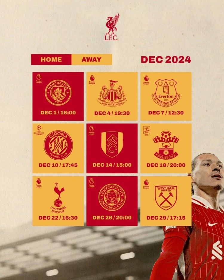 雷速体育12月1日讯 利物浦官方发布球队12月赛历,12月红军将进行9场比赛。其中,12月第一周将迎3场英超硬仗,对手分别是:曼城、纽卡、埃弗顿。